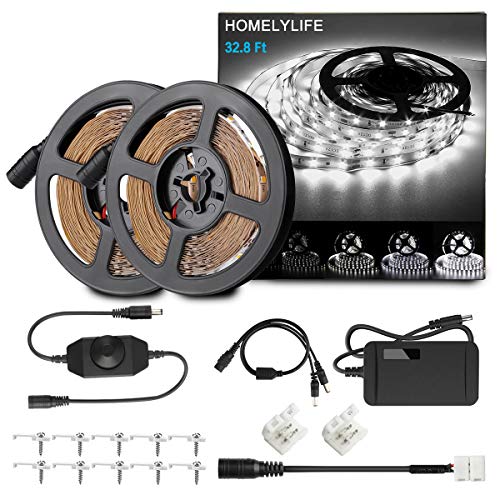 HOMELYLIFE Dimmable LED Strip Lights, 32.8ft 6500K Daylight White Light Strip Kit, 600 LEDs SMD2835 Non-Waterproof 12V LED Vanity Mirror Light, Under Cabinet Lighting Strips, UL Listed Power Supply