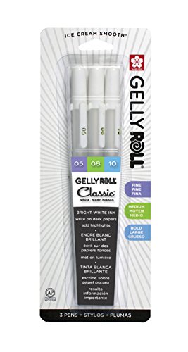 This set of classic Gelly roll pens from Sakura feature White ink and come in 3 assorted nib sizes; fine .5mm, medium .8mm, and bold 1.0mm. The unique gel ink is waterproof, fade resistant and chemical proof. These are the perfect pens For use with dark or colored papers, or to add highlight to artwork. It will not smear, feather or bleed through most papers. Use for card making, scrapbooking and other craft projects.