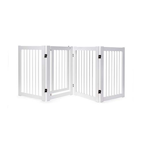 - SPECIFICATIONS: 4-panel wood dog gate with sleek white finish and two-way swing door stands 30″ tall and spans openings up to 72″.
