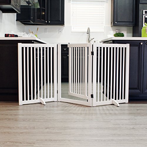 Freestanding 3-Panel wood pet gate with Walk-thru door allows easy movement between spaces, folds down to store easily.