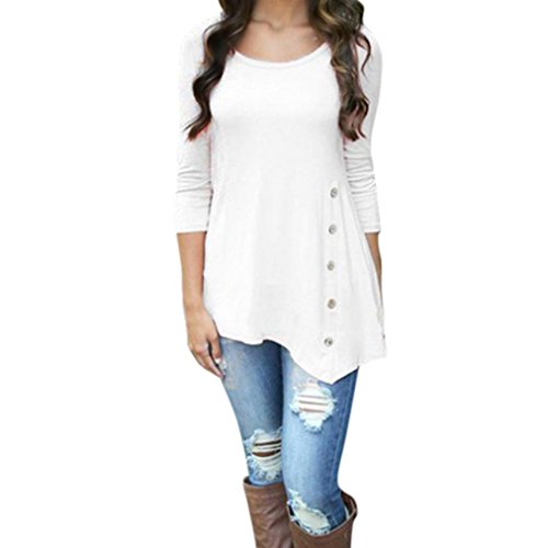 Han Shi Women Tunic Tops, Fashion Long Sleeve Plus Size Button Trim Blouse Crew Neck T-Shirt (White, L)