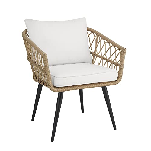 • Tan wicker, black aluminum, and off-white/linen cushions for a modern and versatile look.