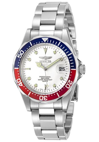 This Pro Diver watch by Invicta features a stainless steel case with a vibrant red and blue tachymeter bezel. This upscale watch features a quartz movement for high-level performance. A stainless steel link bracelet secures with a deployment...