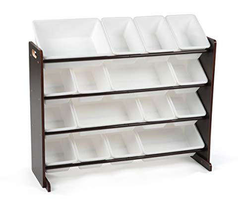 Tot Tutors supersized organizer is a sturdy organizer made of engineered wood, with metal Rods and 16 plastic bins. It is perfect for all YOUR storage needs - toys, arts and crafts, books, nursery, diapers, clothes, office supplies, bathroom,...