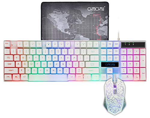 package: -1 x mechanical feeling gaming keyboard -1 x gaming mouse -1 x gaming mousepad Product description: Model:1910w Color: white Cable length:1.5m Click life: 10 million times Dimension:17.32*5.04*0.85 in Compapatible with:Win 7/Win 8/Win...