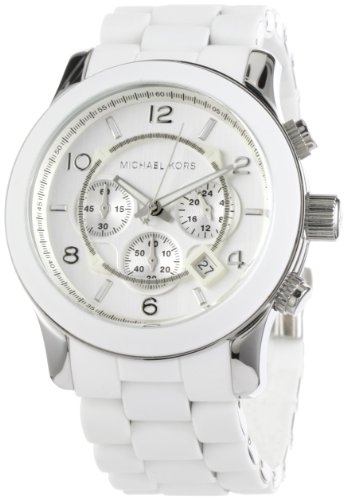 This classic Michael Kors MK5145 women's watch features a white chronograph dial, a date window, three subdials and a white polyurethane and gold-tone mixed metal bracelet and case.The Michael Kors White Runway Watch features a crisp white style...