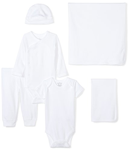 An Amazon brand - This supersoft organic cotton gift set offers a multitude of fun styling options to mix and match including one burp cloth, one blanket, one bodysuit, one long-sleeve side-snap shirt, pants, and one hat; snap-button closures help...