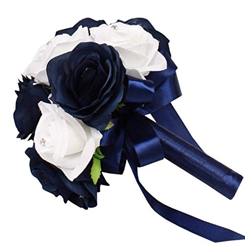 8" Bouquet-navy Blue and White Open Roses with Rhinestone. Handle is white ribbon wrapped decorated with bling. Quality flower arrangement from registered brand: Angel Isabella 8" Bouquet-navy Blue and White Open Roses with Rhinestone. Handle is...
