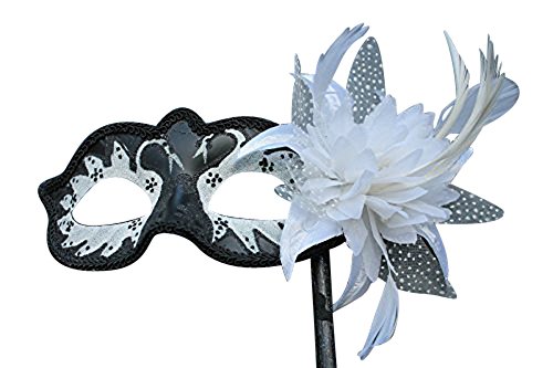 Mask & Co Ladies Quality Black & White Venetian Masquerade Party Ball Eye Prom Hand Held Mask Quality Sparkling Ladies Mask with Co-ordinated FlowerMade of Hard Durable PlasticHand Held on a Black Wooden Stick Entwined with Braid and finished...