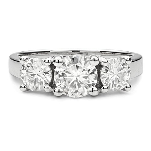 This lovely Forever Brilliant moissanite ring features a trio of glistening round brilliant cut gemstones set in a linear design atop a brightly polished shank. The center stone is 6.5mm and the side stones are 5mm. Beautifully crafted in rhodium...