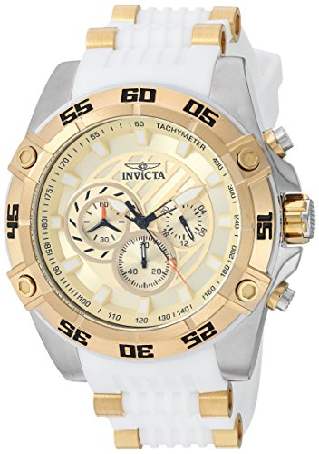Gold metal sunray dial with gold hands and hour markers, chronograph with 24h, 60s, and 60, sub dials, white silicone and polyurethane band and push crown52mm stainless steel case with flame fusion crystalQuartz MovementCase Diameter: 52mmWater...