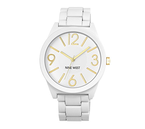 Ensure you're tastefully on time with Nine West White Textured Bracelet Watch. Large goldtone numbers and markers pop against a round white case, while a matching bracelet band completes the chic look of this women's watch. White/GoldtoneFold...