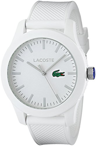 Stainless steel case back. Silicone strap with adjustable buckle closure. Round face, 43mm. Three-hand analog display with quartz movement. White dial features silver-tone hands and hour markers, Lacoste detailing, and brand logo. Splash...