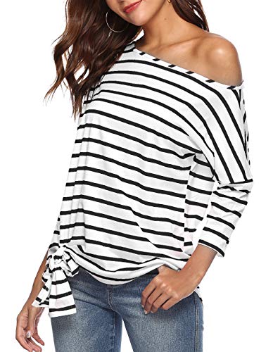 Womens Sexy Oblique Shoulder 3/4 Sleeve Colorful Striped Tunic T-Shirt Casual Loose Tie Front Blouse Top?Sexy 3/4 sleeve off shoulder top,Slash neck tees,Cute stripe shirt,Casual loose blouse,Striped tunic.?Off shoulder, off the shoulder, bell...