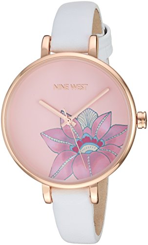 Slightly domed mineral crystal lens; dark pink dial with 3D printed floral design; rose gold-tone handsWhite strap with buckle closureJapanese-quartz MovementCase Diameter: 32mmNot water...
