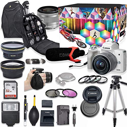 This Canon DSLR Camera Bundle Includes: Canon EOS M50 Mirrorless Digital Camera (White) Canon EF-M 15-45mm f/3.5-6.3 IS STM Lens SanDisk 32GB Ultra Class Memory Card LP-E12 Battery Pack LC-E12 ChargerAC/DC Charger BlowerLens Cleaning Pen Slave...