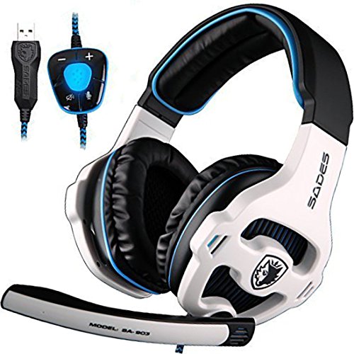 PC Gaming Headset, Sades SA903 Stereo 7.1 Surround Sound USB Wired Computer Headphones with Microphone,Volume Control Over Ear LED Lighting Noise Canceling for Gamers,White/Blue