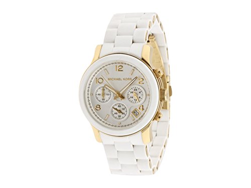 This classic Michael Kors MK5145 women’s watch features a white chronograph dial, a date window, three subdials and a white polyurethane and gold-tone mixed metal bracelet and case.The Michael Kors White Runway Watch features a crisp white style that is ideal for springtime. Its white polyurethane and stainless steel bracelet-style band has a fold-over clasp to lock and hold the oversized gold-toned stainless steel case in place. The dial and bezel are also white, and gold-toned numeric hour markers and luminous hands contrast while keeping the look light. Three chronograph subdials track hours, minutes, and seconds, and a subtle window at the four o’clock position presents the date. With a durable mineral crystal, Japanese quartz movement, and water-resistance to 330 feet (100 meters), the Michael Kors can take a few knocks without missing a beat.