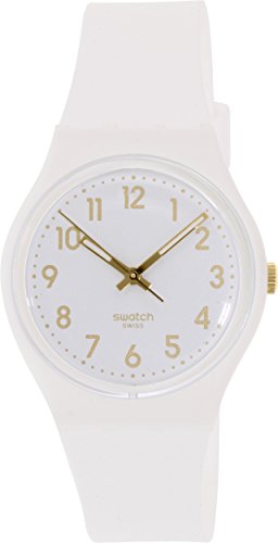 Swatch timepieces are definitely watches to keep your eyes on and this slick accessory is no exception Sporting a classic-style white plastic case and white silicone band this very eye-catching and modern watch is the perfect accessory option for every day wear Additional features include luminous Arabic numeral display water resistant and measures seconds