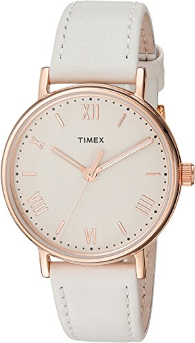 Keep this slim and chic Timex® watch on hand! Stainless steel case. Leather strap with adjustable buckle closure. Round face. Three-hand analog display with quartz movement. Dial features rose gold-tone hands and hour markers, minute track, and Timex detailing. Water resistant 30 meters. Display case included. Imported. Measurements: Case Height: 37 mm Case Width: 37 mm Case Depth: 9 3?5 mm Band Width: 7?10 in Band Circumference/Length: 9 1?4 in Weight: 1.4 oz This product may have a manufacturer’s warranty. Please visit the manufacturer’s website or contact us at warranty@support.zappos.com for full manufacturer warranty details.