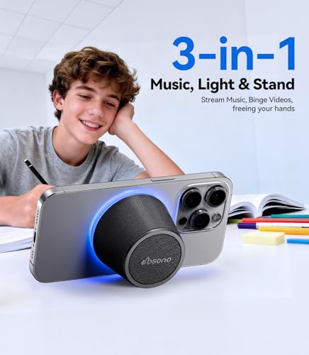 Cell Phone Stand & 9-Mode Color Lights: This portable bluetooth speaker can be directly attached to the back of a phone and doubles as a handy phone stand for hands-free Christmas movie nights; Switch between 9 colorful light modes with one tap—ignite the party or create a cozy vibe instantly. Compact enough to tuck into any stocking stuffers, it’s a 3-in-1 surprise: music, lights, and stand functionality